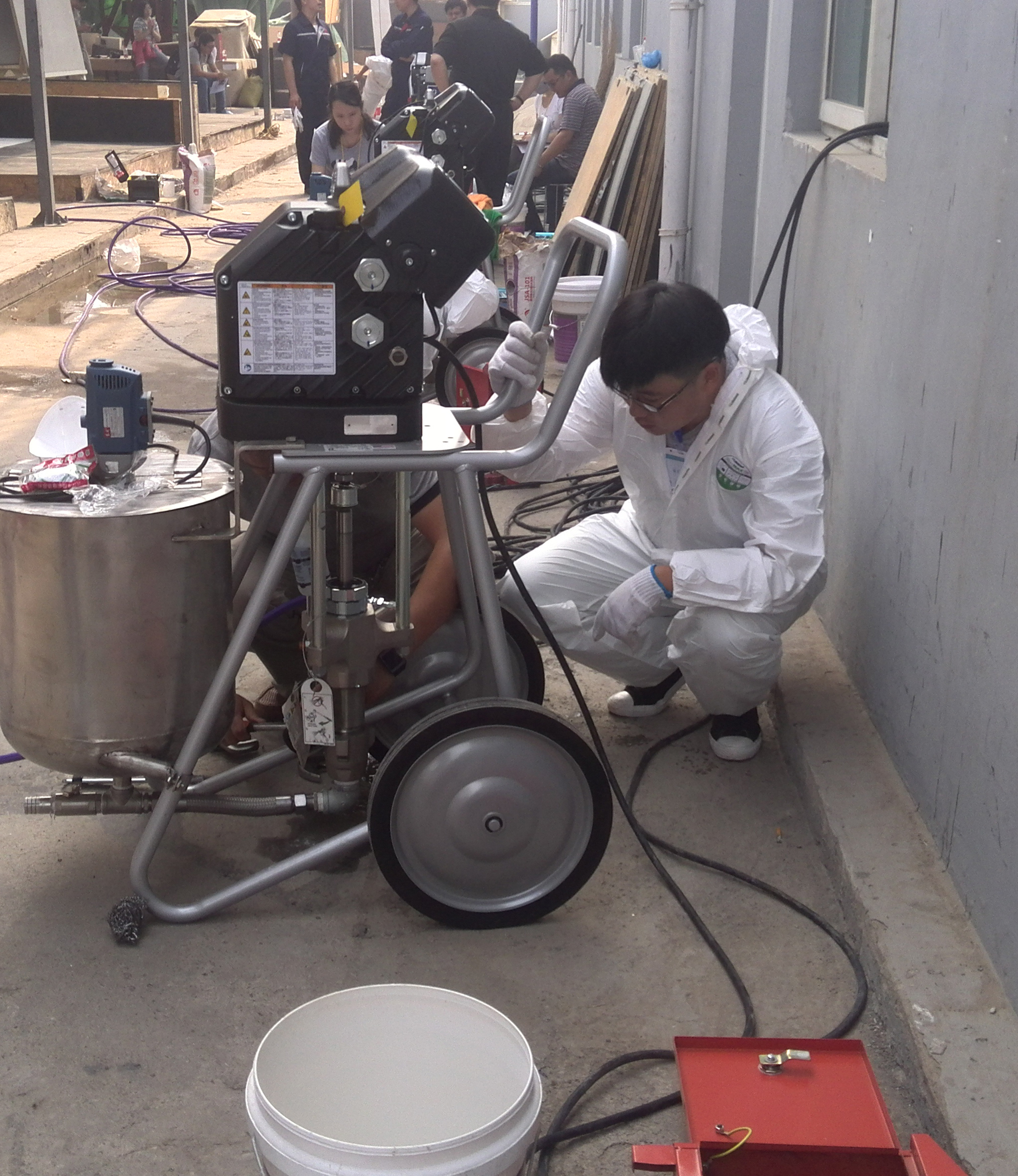 该喷涂施工技能比赛是“全国建筑防水行业职业技能大赛”的重要组成部分,也是全国建筑防水行业职业技能大赛的分赛之一,比赛项目为理论考试和喷涂施工技术,喷涂施工技术比赛的主要内容包括喷涂机械设备拆装清洗,JS的配比、搅拌及立面喷涂。